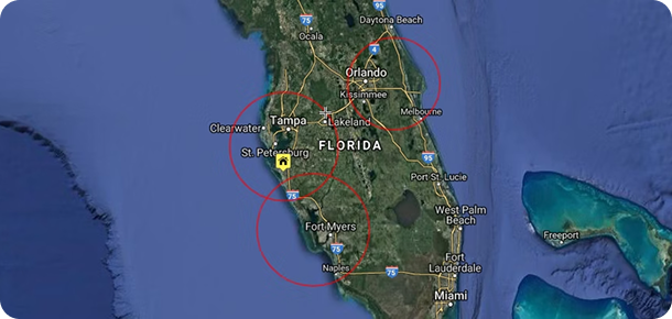 Clearwater, St. Petersburg, Tampa, Bradenton, Sarasota, Venice, Ft. Myers, Naples, Orlando and Melbourne Areas